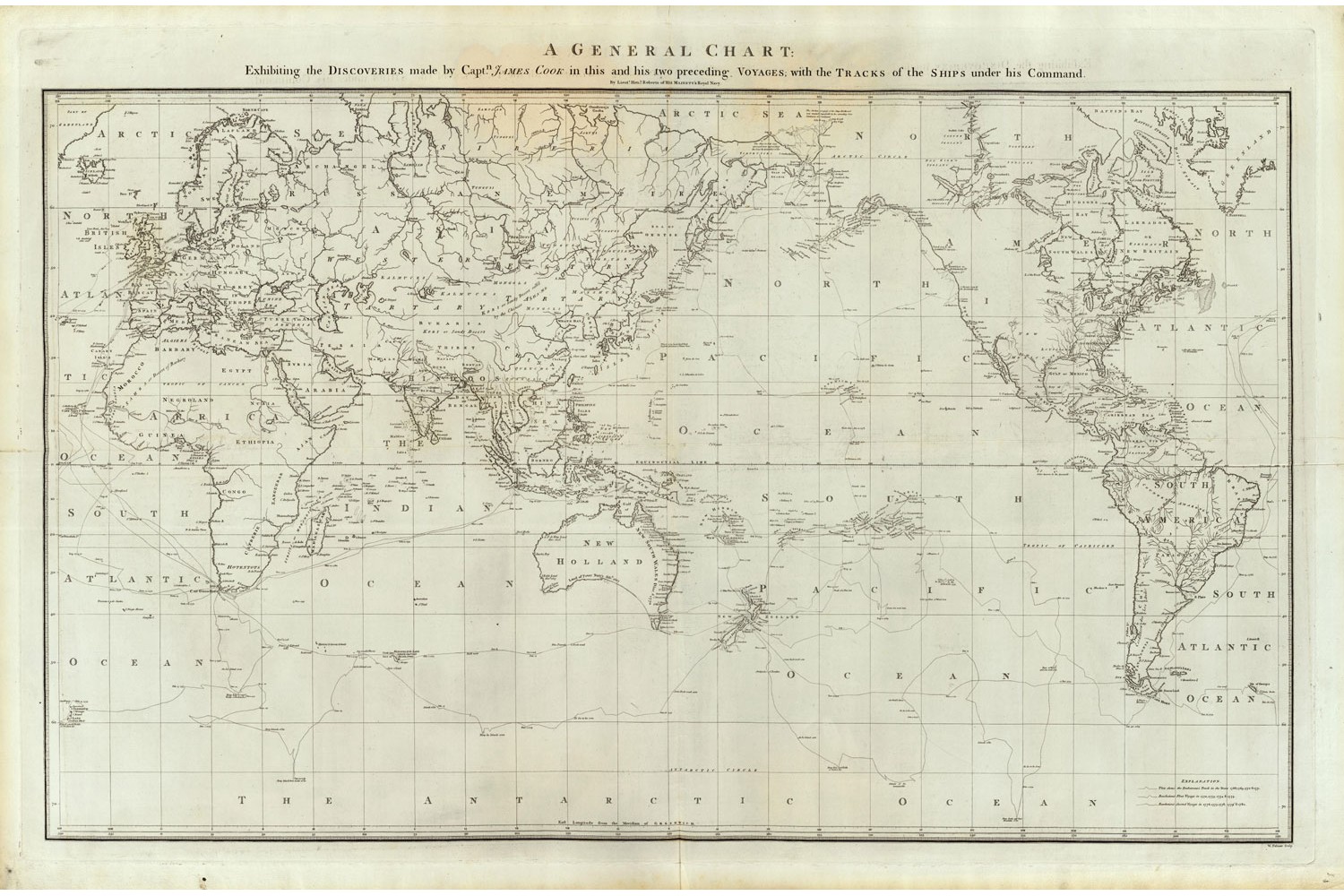 Superbe carte du journal de bord de l'expédition du capitaine Cook, effectuée par son lieutenant de vaisseau Henry Roberts