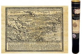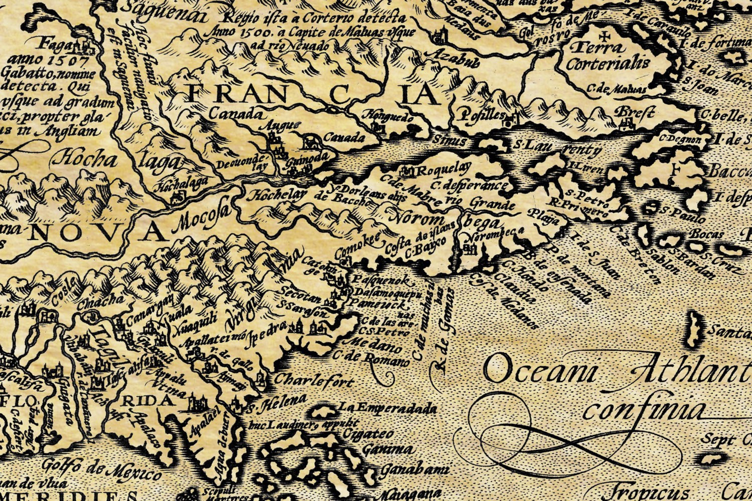 Superbe carte décrivant la nouvelle France (Nova Francia) et les terres mal connues de l'Amérique du Nord. Témoignage émouvant des débuts de la cartographie de ce nouveau continent.