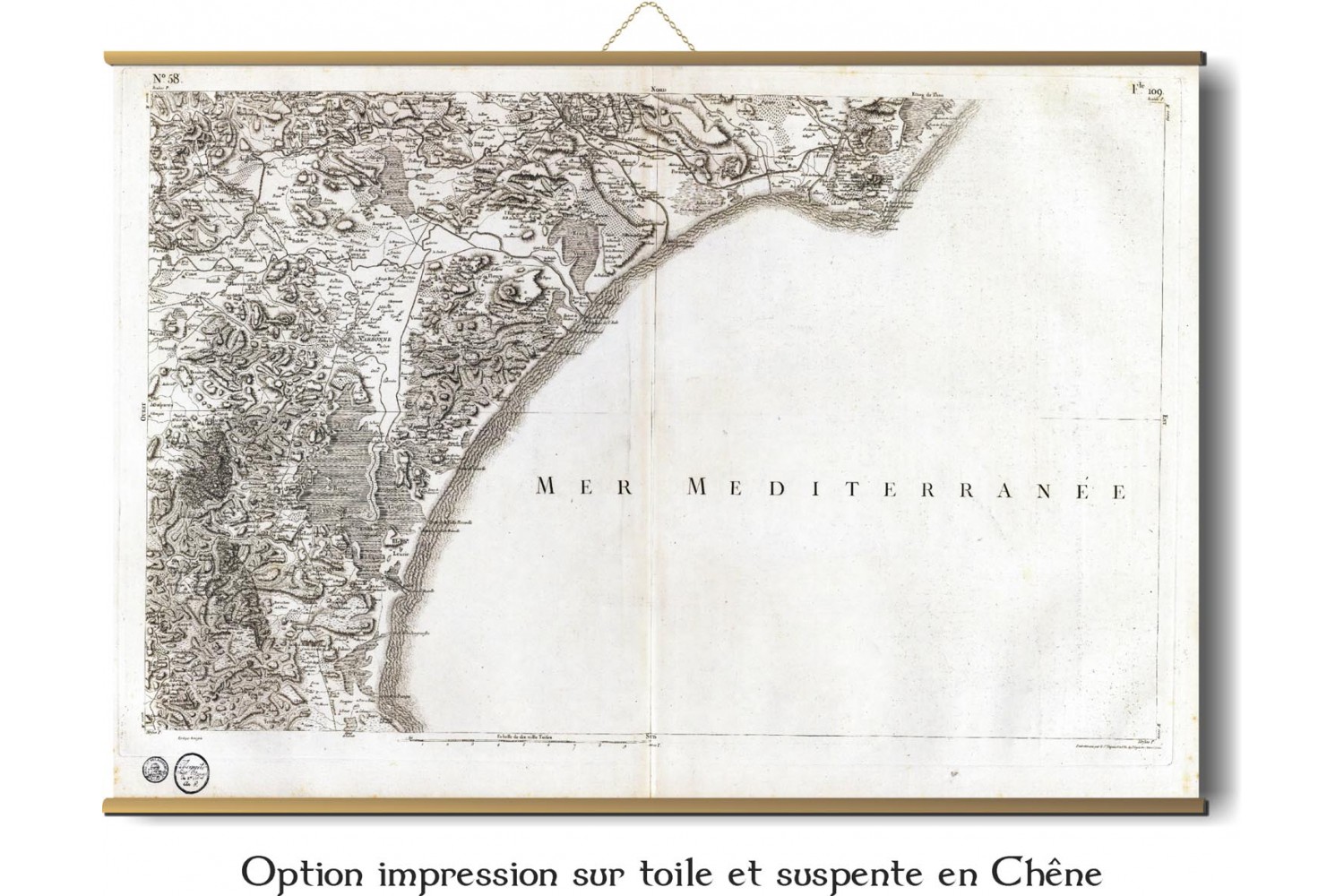 Reprenant Une tradition hollandaise du XVII ème siècle, consistant à accrocher des cartes géographiques aux murs, nous vous proposons des impressions sur toile coton collée sur des baguettes en chêne (1/4 de rond 14 mm)