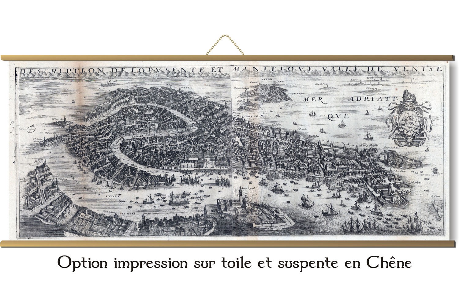 Reprenant Une tradition hollandaise du XVII ème siècle, consistant à accrocher des cartes géographiques aux murs, nous vous proposons des impressions sur toile coton collée sur des baguettes en chêne (1/4 de rond 14 mm)